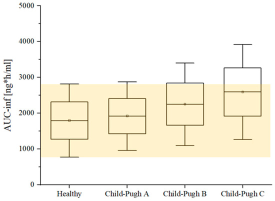 We tailored dosing regimens for etrasimod to individual patients’ specific Child–Pugh scores, ensuring that drug exposure in each population is within the desired therapeutic range. We have selected the dosing regimens that were expected to achieve the target exposure levels comparable to healthy individuals. The extent of drug exposure is often quantified by the AUC_inf, since maintaining a specific drug level is crucial for efficacy and safety [45]. Thus, Box and Whisker plots were used to visually represent the variability in the AUC_inf of etrasimod across various levels of hepatic impairment. For each group of the hepatically impaired population, we created a Whisker box plot to visualize the distribution of AUC_inf, as an indicative of etrasimod exposure, and we gradually reduced the doses accordingly, to have comparable drug exposure to healthy individuals.