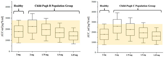 For dosing optimization, Box and Whisker plot analysis revealed that 1.5 mg (75% of the dose given to the healthy population) in Child–Pugh-B group (Figure 8, left panel) and 1.25 mg (62.5% of the dose given to healthy population) in Child–Pugh C group (Figure 8, right panel) provided the closet exposure to the 2 mg single dose in healthy population, where both means and SEs were included in the range of healthy population.