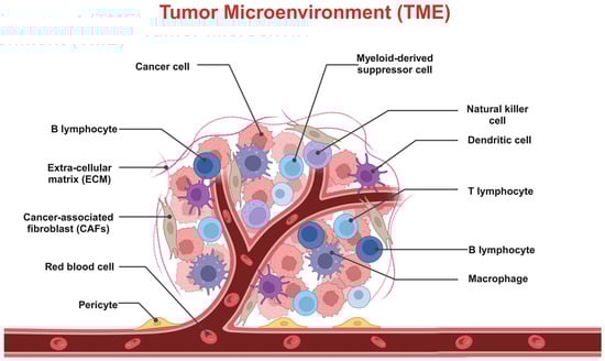 Composition of the TME. The TME consists of a variety of cellular and non-cellular components, including tumor-associated fibroblasts (CAFs); immune cells such as macrophages, T cells, natural killer cells, and endothelial cells; pericytes; the extracellular matrix (ECM); and growth factors and cytokines. Created with BioRender.com.