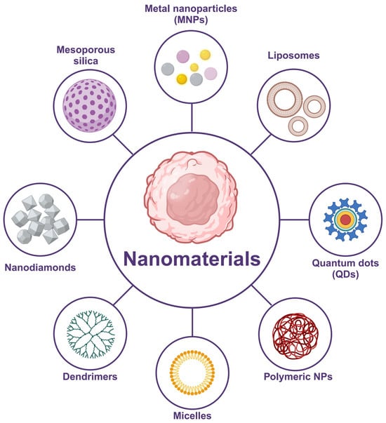 Schematic diagram of nanomaterials employed to diagnose and treat cancers, including nanodiamonds, mesoporous silica, metal nanoparticles (MNPs), liposomes, quantum dots (QDs), polymeric NPs, micelles, and dendrimers. Created with BioRender.com.