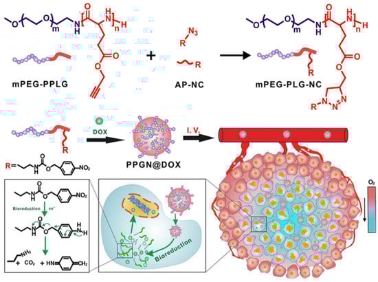 The p-nitrobenzyl groups in mPEG-PLG-NC are supposed to be reduced to p-aminobenzyl groups by overexpressed nitroreductase in hypoxic cells and undergo spontaneous fragmentation via 1,6-elimination, resulting in hypoxiaresponsive drug release. (Reprinted with permission from [58]. Copyright 2020 American Chemical Society).
