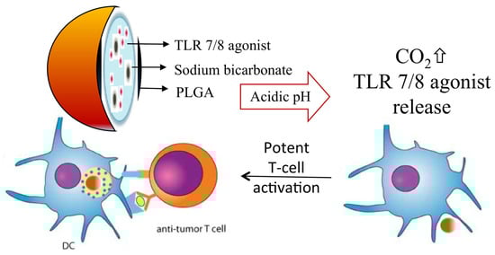 Acidic pH-responsive poly(lactide-co-glycolide) (PLGA) nanoparticles for the endo-lysosome-specific release of 522, a novel TLR7/8 agonist. Bicarbonate salt was incorporated into the new formulation to generate carbon dioxide (CO2) gas at acidic pH, which can disrupt the polymer shell to rapidly release the payload, and the polymer shell can be used for the release of the payload. (Reprinted with permission from [71]. Copyright 2018 Royal Society of Chemistry).