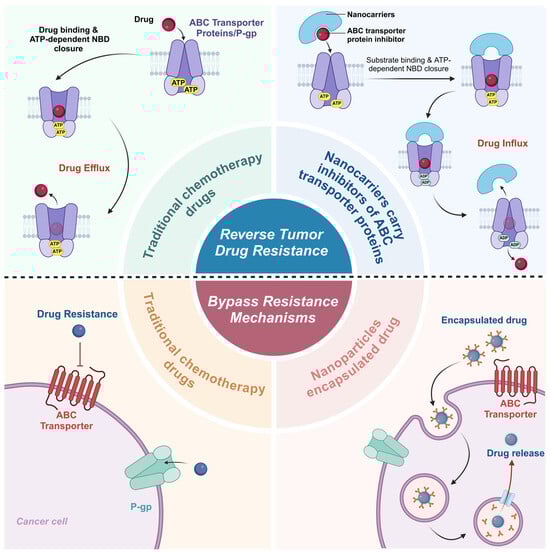 Tumor cells develop drug resistance in various ways, among which multidrug resistance (MDR) is the most common [94]. MDR is usually triggered by the overexpression of ATP-binding cassette transporters (ABC transporters) such as P-glycoprotein (P-gp), which actively expel chemotherapeutic drugs from tumor cells, thus making the drug concentration insufficient for therapeutic effects [95]. Nanodrug delivery systems can bypass the drug efflux mechanism by encapsulating anticancer drugs in nanoparticles and avoiding their direct contact with ABC transporter proteins (Figure 5). For example, liposome and polymer nanoparticles can effectively encapsulate conventional chemotherapeutic drugs, such as doxorubicin and paclitaxel, and protect them inside the nanoparticles [96]. In this way, the drug will not be recognized and excreted by transporter proteins until the nanoparticles are endocytosed by the cells and then enter into the tumor cells and release the drug. In addition, some nanoparticles can be degraded in the acidic or enzymatic environment inside the tumor cells, releasing a high concentration of the drug, further overcoming the effect of drug efflux [61].