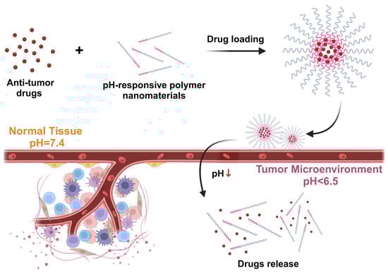 Mechanism of pH-responsive polymer nanomaterials for tumor-targeted drug delivery. Anti-tumor drugs are encapsulated into pH-responsive polymer nanomaterials through a drug-loading process. In normal tissues (pH = 7.4), the nanomaterials remain stable, minimizing premature drug release. Upon reaching the acidic tumor microenvironment (pH < 6.5), the pH-responsive polymers degrade, triggering the controlled release of the encapsulated drugs. This mechanism enhances drug delivery efficiency to tumor cells while reducing off-target effects in normal tissues. Created with BioRender.com.
