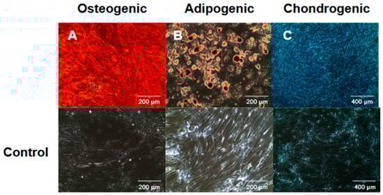 The MSC strains at passage four or five were induced in vitro to undergo osteogenic, chondrogenic, and adipogenic differentiation using the specific StemPro Differentiation Kits (Gibco Invitrogen, Grand Island, NY, USA) for osteogenesis, chondrogenesis, and adipogenesis. Media were prepared according to the manufacturer’s datasheets for each differentiation type. After a few days, staining was observed under an Olympus CK40 optical microscope (Figure 1) [10].