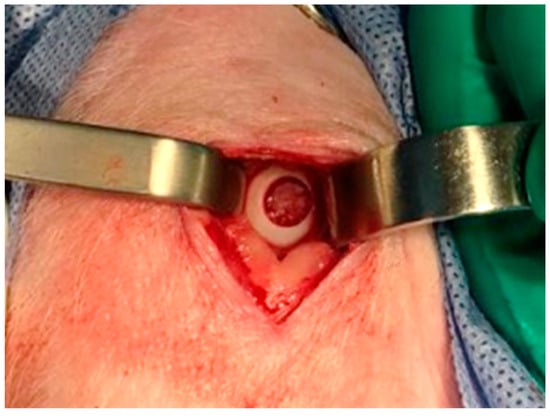 A full-thickness cartilage defect, with a diameter of 6 mm (Figure 3), was created in the weight-bearing region of the medial femoral condyle on both hind limbs of each pig. Subsequently, the TEC was inserted into the defect [13].