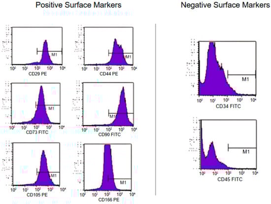 Flow cytometry analysis showing positive reactions to mesenchymal markers (CD29, CD73, CD105, CD44, CD90, and CD166) and negative reactions to hematopoietic (CD34 and CD45). In purple, the cell population that presents the respective marker.