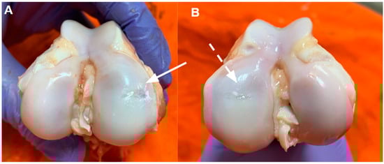 Cartilage defect 6 months after surgery, arrows indicate the region where the defect was made. (A) Defect-only (solid arrow); (B) defect treated with a tissue engineering construct (TEC) (dashed arrow).