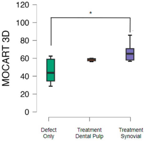 Overall assessment score values in MOCART 3D score for the defect-only (untreated), dental pulp treatment, and synovial treatment groups, showing a significant difference * (p < 0.05) between the defect-only group and the group treated with a TEC from the synovial.