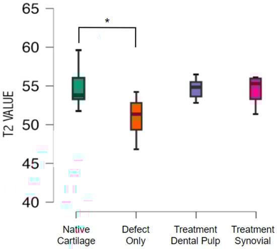 Mean T2 values of the groups from native (adjacent cartilage), defect-only (untreated), dental pulp treatment, and synovial treatment groups. There was a significant difference * (p < 0.05) between native cartilage and defect-only groups.