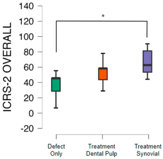 Mean value of overall assessment of cartilage repair using the ICRS-2 histological score for the defect-only (untreated), dental pulp treatment, and synovial treatment groups. A significant difference * (p < 0.05) was found between the defect-only group and the group treated with a TEC from synovial membrane.