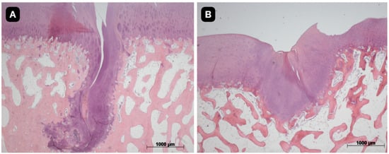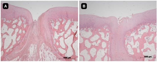 Histological evaluation of (A) defect-only in posterior knee; (B) defect treated with a TEC from dental pulp in posterior knee.