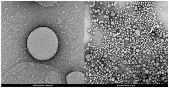 The morphology was confirmed by TEM, whose images are presented in Figure 2. It was possible to verify the spherical morphology of the particles and confirm the size data obtained via DLS. The particles presented a spherical and homogeneous morphology, as expected, because the preparation of the particles started from a nanoemulsion using a surfactant, where the spherical shape corresponds to the formation of micelles of this amphiphilic compound. Traditional nanoparticles produced using bottom-up techniques are limited to spheres, partly because of the lack of fabrication technology to control their shapes. These techniques rely on the self-assembly and aggregation of nanoparticles and depend on various factors, such as thermodynamic energy minima and entropy limitations, or factors affecting molecular self-assembly [48]. The energy-minimizing stable structures tended to be spherical, with the least surface per-unit volume. However, with the same volume, non-spherical particles have a larger surface area than spherical particles, giving rise to a larger flux per-unit volume [49]. The optimal morphology depends on the formulation goal, with the spherical shape better controlling the flux and preserving the essential oil, which is the case here.