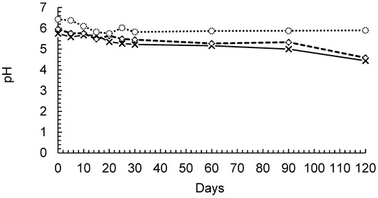 pH monitoring of nanocapsules (-◊-), nanoemulsions (-x-), and PCL particles (-○-).
