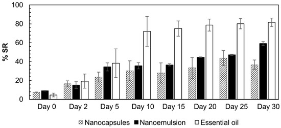 The antioxidant activity of the formulations presented in Figure 5 was evaluated to assess their stability and essential oil release/evaporation processes. On day zero, the absorbances of the formulations and free essential oil were measured after 2 h of reaction. The essential oil presented low antioxidant activity (%SR = 4.5), which confirmed the data reported in the literature [14].