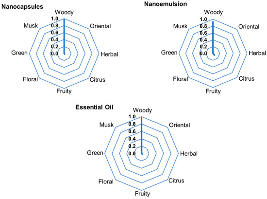The perfumery radars (PRs) of the formulations containing A. satureioides essential oil are presented in Figure 6. Despite the close values in the vapor pressure between α-pinene, camphene, and β-pinene, their aromatic intensity values are considerably different, since their concentrations in the liquid phase are in an approximately 40:2:1 ratio. α-pinene, β-pinene, limonene, and β-caryophyllene were considered for the perfumery radar, since their headspace concentrations were significant; all other compounds presented in Table 7 were only present in trace amounts. There were no differences among the PRs of the emulsions, nanoparticles, and pure essential oils, because α-pinene is the dominant compound, which gives the A. satureioides essential oil its characteristic woody aroma.