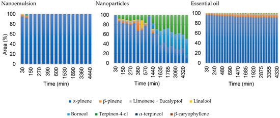 The gas-phase composition profile of the nanocapsule release was significantly different from that of the nanoemulsion. Initially, α-pinene dominated the composition, indicating that the free α-pinene in the solution initially evaporated in a greater proportion. After 90 min, the β-pinene composition increased to approximately 7%. α-copaene appeared after 1440 min of diffusion, reaching 30% of the composition in 1635 min. The nanoemulsion presented a profile similar to the diffusion profile of the essential oil; however, in this case, there was a greater predominance of α-pinene.