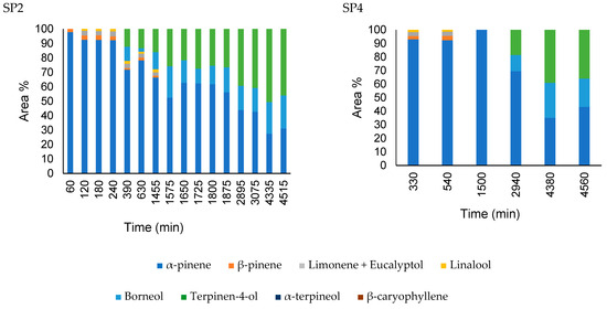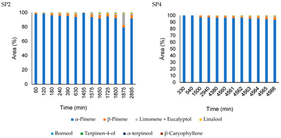The headspace diffusion profiles for the nanocapsules and pure oil obtained in the second and fourth sampling ports, 250 and 1500 mm from the liquid–vapor interface respectively, are presented in Figure 8 and Figure 9, using the same layout as da Silva et al. [23]. The gas-phase composition of nanoemulsion containing A. satureioides essential oil (EM3) in the sampling ports SP2 and SP4 was constant, and only α-pinene was detected during the analysis, with traces of other compounds, which justifies the non-inclusion of these nanoemulsion graphs in Figure 8 and Figure 9.