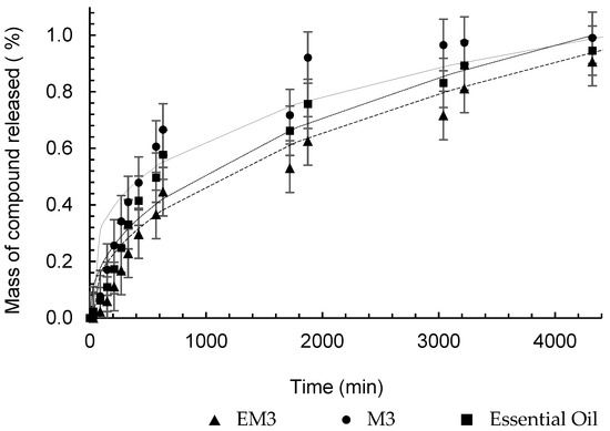 Release studies of formulations aimed at protecting flavor and fragrance have been performed using pure compounds [59,60,61]. The study of evaporation and air diffusion of compounds in a complex mixture such as essential oils is challenging, and the adopted methodology, through marker compounds, is pioneering and presents consistent results, in addition to those presented by da Silva et al. [25].