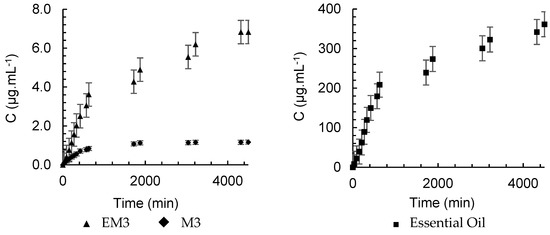 The release kinetics of α-pinene from M3, presented in Figure 10, was faster than that of EM3, which is evidenced by the values of k, which were 0.0786 min−n and 0.0189 min−n, respectively. This result appears to contradict the purpose of encapsulation, but by analyzing the concentration versus time, shown in Figure 11, the difference in the amount of α-pinene released is evident. The polymer accelerated the release kinetics, since the stationary period was reached at 630 min, but it also retained more α-pinene, which promoted its controlled release in low doses for a longer period. The kinetic behavior of pure oil showed no significant difference between the formulations and the essential oil (Figure 11), but the difference between the concentration of the compound released at every instant was relevant. The maximum concentration of α-pinene in the nanoparticle gaseous phase was 1.16 μg.mL−1, whereas in the nanoemulsion, it was no more than 6.83 μg.mL−1. For the pure oil, after 30 min of diffusion, the concentration in SP1 was already 8.26 μg.mL−1 and the maximum measurement was 361.5 μg.mL−1.