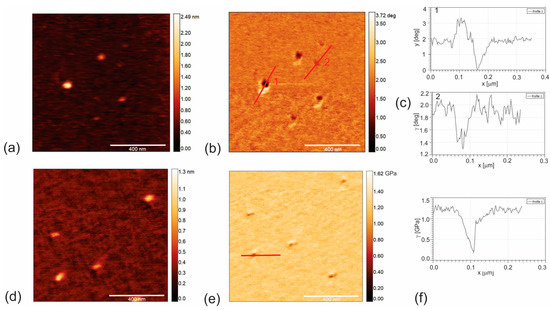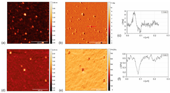 The nanomechanical measurements were conducted using the same microscope operated in the amplitude modulation–frequency modulation viscoelastic mapping mode using the same cantilever used previously [8]. To determine the distribution of the Young’s modulus of elasticity, frequency, amplitude, and phase of the two modes, a contact mechanics model was used [21].