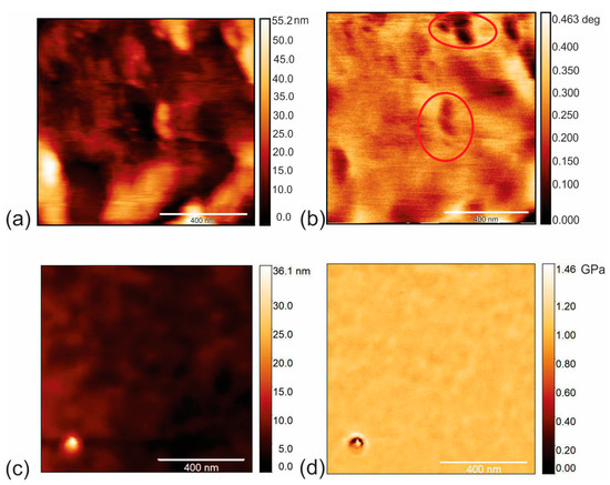 Surface morphology, including the EFM and AMFM (viscoelastic measurements) of CAUR-CQDs/PU and GQD50/PU composite films, is shown in Figure 3 and Figure 4. Figure 3a presents the morphology of the CAUR-CQDs/PU composite films (height retrace mode), and Figure 3b shows the EFM image (nap retrace mode), i.e., the charge distribution inside the polymer matrix. Black voids inside the red circle represent the CAUR-CQDs nanoparticles distributed inside the polymer pores. The size of these black voids indicates that carbon dots have formed clusters inside the polymer matrix. From Figure 3b, we concluded that there was no homogeneous distribution of the CAUR-CQDs nanoparticles inside the polymer matrix. The root-mean-square (RMS) roughness of this polymer composite is 1.93 nm compared to the RMS of 3.14. nm for neat PU film. After the encapsulation of the CAUR-CQDs nanoparticles into the polymer films, the RMS decreased 1.63 times, and in this way, the polymer surface becomes smoother. Figure 3c,d shows the surface morphology and AMFM images (Young’s retrace mode) of the CAUR-CQDs/PU composite films.