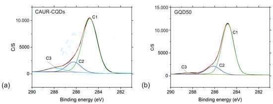 XPS deconvoluted C1s spectra of (a) CAUR-CQDs and (b) GQD50 nanoparticles.