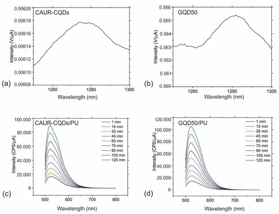 Singlet oxygen generation determined by two methods: the measurement of luminescence of singlet oxygen at 1280 nm of (a) CAUR-CQDs nanoparticles and (b) GQD50 nanoparticles; the measurement of the PL of SOSG used as a fluorescence probe at 530 nm: (c) CAUR-CQDs/PU and (d) GQD50/PU composite films samples.