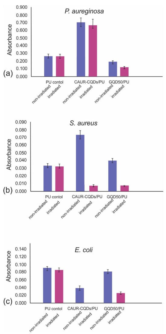 Apart from the fact that biofilms are key factors in microscale ecosystems such as subbarrier or marine biofilms [43], the significant presence of biofilms can be found in healthcare facilities on various surfaces such as door handles, switches, keyboards, bed rails, etc., including hospital instruments, triggering different infections. Figure 7 shows the antibiofouling activity of the CAUR-CQDs/PU and GQD50/PU composite films against three bacterial strains: P. aeruginosa, S. aureus, and E. coli. Figure 7a shows that the GQD50/PU composite films reduce P. aeruginosa biofilms by almost 50% compared to the results for the control, with or without blue light irradiation for 1 h.