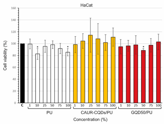 Cytotoxicity effects of PU, CAUR-CQDs/PU, and GQD50/PU toward human epidermal keratinocyte HaCaT cells. Cells were treated for 24 h with the indicated concentrations of the medium (1, 10, 25, 50, 75%, and 100%) previously incubated with the tested materials for 24 h. Values are normalized to untreated control cells (C), expressed as 100%. Data are presented as means ± SD of at least three independent experiments performed in triplicate. Asterisk (*) indicates p < 0.05.
