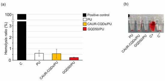 Apart from cytotoxicity, as a part of a biocompatibility’s studies, we investigated the hemolytic properties of the neat PU, CAUR-CQDs/PU, and GQD50/PU composite films. The hemolysis test is used to determine the capacity of the material to induce the destruction of red blood cells and hemoglobin release. As presented in Figure 9, panel a, all tested samples exhibited good blood compatibility, with hemolysis ratios between 0.23% for GQD50/PU and 0.61% for PU (Figure 9, panel a). A visual inspection of the tested composite films samples (Figure 9, panel b) showed that hemoglobin was observed only in the positive control sample, while the color of the other samples varied from clear to pale yellow, without any signs of hemoglobin outflow. The hemolysis ratio for all tested composite films samples did not exceed 1%, which classified them as safe materials, with no hemolytic activity (values < 5% are considered to show a low hemolysis ratio and indicate good blood biocompatibility).