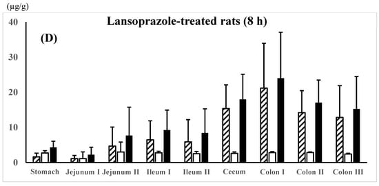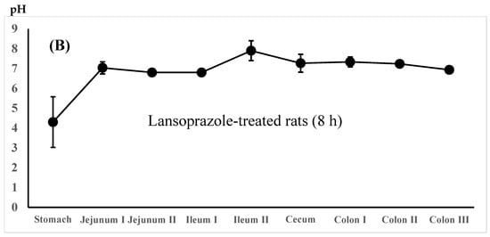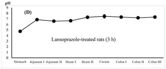 It has been reported that the solubility of 5-ASA, an ionized drug, correlates positively with the gastrointestinal pH in three animal species (rats, rabbits, and pigs) and is significantly influenced by the pH difference. In contrast, the solubility of prednisolone, an un-ionizable drug, is not correlated significantly with pH changes, buffer capacity, osmolality, or surface tension [31]. Regarding the buffer capacity of luminal fluids, foods can cause resistance to a pH change due to the presence of acid/base groups. In addition, dynamic pH changes occur in human gastrointestinal fluids due to the low buffer capacity along the gastrointestinal tract in fasted and fed states in healthy subjects [34,35]. In humans, 5-ASA solubility increases down the gastrointestinal tract as follows: 1.97 ± 0.25, 3.26 ± 0.08, 6.24 ± 1.13, and 7.95 ± 0.21 mg/mL in the jejunal, ileal, ascending, and transverse/descending colonic fluids, respectively. 5-ASA solubility depends on the pH and buffer capacity (the ability of a solution to resist changes in pH), in which the buffer capacity was more important than the pH [36]. The lesser effect of dosing vehicle and lansoprazole treatment of rats on the luminal fluid pH in the present study (Figure 2C,D and Figure 4A,B) may have been due to the food intake of the rats employed (fed rats).
