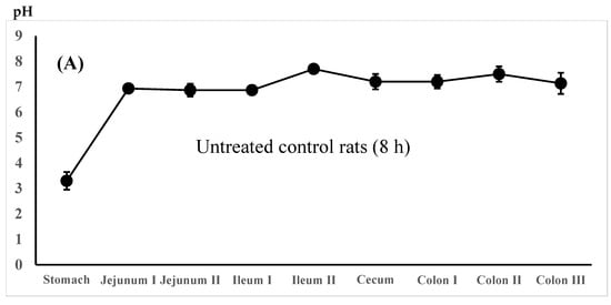 The dissolved amounts of 5-ASA in each gastrointestinal tract region in vivo depend on the regional pH, buffer capacity, and luminal water volume. The regional pH of luminal fluids reported in rats and humans was as follows: in rats, pH 4.16 ± 0.01 in the stomach, pH 5.99 ± 0.01 in the proximal small intestine, pH 6.34 ± 0.01 in the mid intestine, pH 6.76 ± 0.04 in the distal small intestine, pH 6.08 ± 0.01 in the cecum, and pH 5.89 ± 0.01 in the proximal colon; in humans, pH 1.0–2.5 in the stomach, pH 3.1–6.7 in the proximal intestine, pH 7.1 ± 0.5 in the mid-small intestine, and pH 7.2 ± 0.9 (pH 6.0–7.7) in the distal small intestine [31]. Similarly, the intestinal luminal pH in healthy humans has been reported as follows: pH 6.25 ± 0.13 in the duodenum, pH 6.95 ± 0.12 in the jejunum, and pH 7.64 ± 0.16 in the ileum during the digestive period of a semiliquid 300 mL test meal, and pH 6.31 ± 0.18 in the duodenum, 7.08 ± 0.18 in the jejunum, and 7.81 ± 0.12 in the ileum during the subsequent inter-digestive period [29]. The small-intestinal luminal pH determined using a radiotelemetry capsule in healthy volunteers was as follows: pH 5.5–7.0 (mostly pH 6.4–6.8) in the proximal small intestine, pH 6.5–7.7 (mostly pH 7.3–7.7) in the distal small intestine, pH 5.5–7.5 (mostly pH 5.8–6.8) in the cecum/right colon, and pH 6.5–7.5 (mostly pH 7.0–7.2) in the left colon [32]. Similarly, the average pHs of the gastrointestinal fluid in healthy humans were pH 1.82, 4.97, 5.67, 6.17, and 6.62 in the stomach, duodenum, proximal jejunum, middle jejunum, and distal jejunum, respectively [33]. The luminal pH, especially stomach and proximal small intestine in humans, is slightly altered by food intake as follows: in a fasted condition, pH 2.9 ± 1.97 in the stomach, pH 6.71 ± 0.44 in the duodenum, pH 6.8 ± 0.4 in the jejunum, and pH 6.5 ± 0.2 in the ileum; in a fed condition, pH 4.3–5.4 in the stomach, pH range 3.1–6.0 in the duodenum, pH range 5.2–6.0 in the jejunum, and pH range 6.8–8.0 in the ileum [14]. The luminal pH of fed rats observed in the present study (Figure 2C,D and Figure 4A,B) was close to that of fed conditions in humans [14]. It was found that the dosing vehicle pH, the 5-ASA solubility in the dosing preparations, and the treatment of rats with lansoprazole seemed to not affect the luminal pH much, and therefore, the 5-ASA solubility in vivo in fed rats with food in their stomachs and intestinal tracts. Thus, the 5-ASA solubility is thought to be determined by the intrinsic regional pH rather than the dosing vehicle solubility.