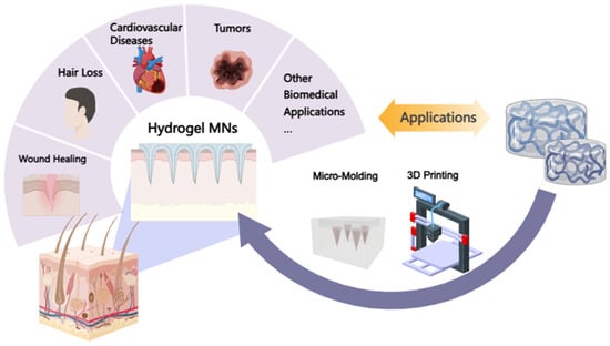 HMNs deliver the loaded ingredients directly into the deeper layers of the skin through micro-punctures. The tiny holes formed by the microneedles heal rapidly while avoiding the hepatic first-pass effect and gastrointestinal degradation associated with systemic drug administration. This results in advantages such as strong permeability, ease of administration, and fewer side effects. Consequently, transdermal drug delivery using HMN has been a major research focus in the medical field. Currently, the research on HMN for disease treatment is primarily focused on wound healing, hair loss, diabetes, cardiovascular diseases, and cancer treatment.