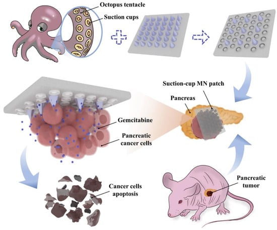 - Fu, X.; Zhang, X.; Huang, D.; Mao, L.; Qiu, Y.; Zhao, Y. Bioinspired adhesive microneedle patch with gemcitabine encapsulation for pancreatic cancer treatment. Chem. Eng. J. 2022, 431, 133362. [Google Scholar] [CrossRef]