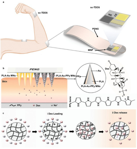 Schematic overview of the design and function of the sc-TDDS. (a) The sc-TDDS consists of PENG and MNP; (b) MNP includes PLA-Au MNs and PLA-Au-PPy MNs loaded with Dex; (c) The mechanism of loading and releasing Dex with PPy. Copyright permission from Yang et al. [45], Advanced Functional Materials, 2021.