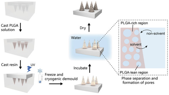 - Ling, Z.; Zheng, Y.; Li, Z.; Zhao, P.; Chang, H. Self-Healing Porous Microneedles Fabricated Via Cryogenic Micromoulding and Phase Separation for Efficient Loading and Sustained Delivery of Diverse Therapeutics. Small 2024, 20, 2307523. [Google Scholar] [CrossRef] [PubMed]