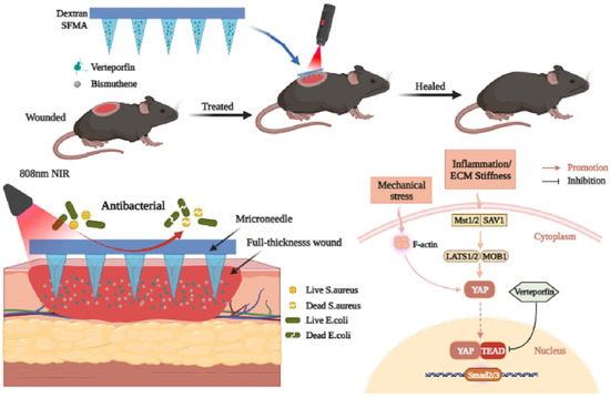 - Wei, C.; You, C.; Zhou, L.; Liu, H.; Zhou, S.; Wang, X.; Guo, R. Antimicrobial hydrogel microneedle loading verteporfin promotes skin regeneration by blocking mechanotransduction signaling. Chem. Eng. J. 2023, 472, 144866. [Google Scholar] [CrossRef]
