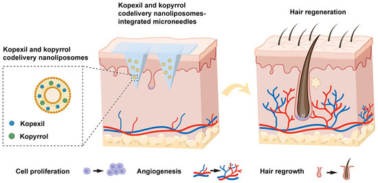 - Zhang, S.; Zhou, H.; Chen, X.; Zhu, S.; Chen, D.; Luo, D.; Chen, S.; Liu, W. Microneedle Delivery Platform Integrated with Codelivery Nanoliposomes for Effective and Safe Androgenetic Alopecia Treatment. ACS Appl. Mater. Interfaces 2024, 16, 15701–15717. [Google Scholar] [CrossRef]