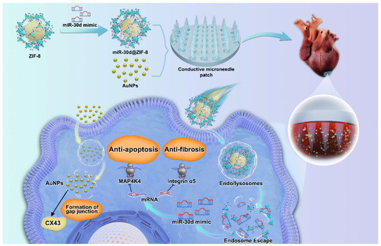 Cardiovascular diseases are the leading cause of death worldwide, and microneedles offer a promising new approach to treating these diseases while improving therapeutic outcomes [81,82]. Inhibiting fibroblast activation during the mature phase of cardiac repair can improve cardiac remodeling and function after myocardial infarction (MI) [83,84]. Based on this concept, Chen et al. [85] designed a GelMA hydrogel microneedle patch that loads galunisertib at the microneedle tips to enable targeted myocardial drug delivery. This approach highlights the potential of microneedle patches as an advanced drug delivery platform, capable of locally and minimally invasively delivering antifibrotic agents to prevent myocardial fibrosis, thereby treating myocardial infarction and promoting cardiac repair. In another study, Yuan et al. [86] developed a biocompatible gelatin-based microneedle patch loaded with exosomes containing antifibrotic microRNA-29b (miR-29b) mimics to prevent excessive cardiac fibrosis following myocardial infarction. When applied to infarcted myocardium in a mouse myocardial infarction model, this microneedle patch increased retention of the loaded exosomes within the infarcted tissue, thereby reducing inflammation, limiting infarct size, suppressing fibrosis, and improving cardiac function. Prompt blood reperfusion following myocardial infarction can paradoxically cause ischemia-reperfusion injury (I/RI), a challenge not yet fully addressed by current clinical therapies [87,88]. Chen et al. [89] developed a nanoparticle-microneedle patch system for miR-30d delivery in a mouse model of myocardial I/RI. This system consists of ZIF-8 nanoparticles and a conductive microneedle patch (Figure 10). The ZIF-8 nanoparticles, loaded with miR-30d, use the proton sponge effect to escape endocytosis, thereby avoiding premature degradation in lysosomes. Concurrently, the conductive microneedle patch enables local, efficient, and sustained delivery of miR-30d within the myocardium and releases gold nanoparticles to restore electrical impulses in the infarcted myocardium.