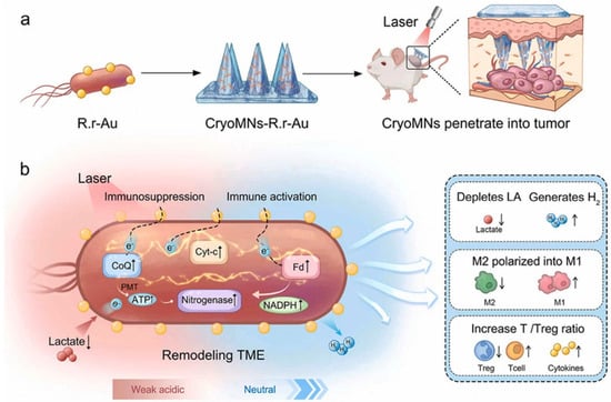 Schematic outline of the fabrication and application of CryoMNs-R.r-Au. (a) CryoMNs-R.r-Au utilizes cryomicro needles for transdermal delivery of nanogold-engineered Rhodospirillum rubrum, aiming to remodel the tumor microenvironment through optical biotherapy. (b) Under laser irradiation, R.r-Au can effectively enhance lactate consumption and hydrogen production via photochemical transformation by transferring electrons into the photosynthetic system of R. rubrum, thereby improving antitumor immune activation. Copyright permission from Shi et al. [105], Bioactive Materials, 2024.