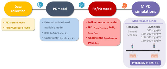 For dosage selection in a patient, the ideal treatment and addressing events of insufficient response, gradual depletion of efficacy, or the advent of side effects, dermatologists must adopt an adaptable approach for treating chronic psoriasis vulgaris that contemplates dosage regimens not included in the SmPC (non-labeled) and transitions between various therapeutic alternatives of the disease. These obstacles underline how crucial it is to switch in the direction of model-informed precision dosing (MIPD) techniques based on population pharmacokinetic/pharmacodynamic (PK/PD) models. Because MIPD allows for the use of any timed sample, interventions can be carried out before the initial dosage or until a steady state is attained. The procedure of intervention determines a dosage that meets a predetermined target for PK/PD [29,30,31,32,33,34]. Therapeutic results and patient safety are improved when PK/PD models are used in dosage selection for the control of chronic plaque psoriasis, since they address the interindividual variability (IIV) in therapy responses and increase precision dosing [35,36,37]. Therefore, this study aims to suggest a strategy for individualizing dosage regimens of SCK in patients with moderate to severe long-lasting psoriasis vulgaris reflecting the uncertainty associated with individual parameters obtained from a population PK/PD model.