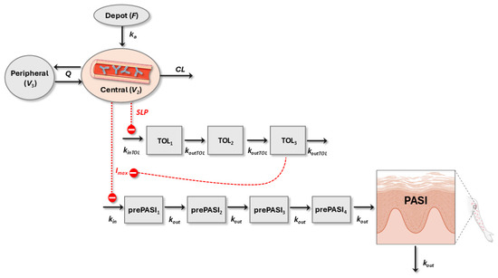 An indirect response [50] was selected to describe the relationship between SCK concentration and PASI observations in which SCK inhibits the zero-order evolution constant rate of psoriatic skin lesion (kin). The inhibition of kin through an Imax model provided a statistically significant reduction in the objective function value (p-value < 0.01). Other mAbs intended to treat moderate to severe chronic psoriasis vulgaris have previously used this model structure [51,52,53,54,55,56]. To capture the delay between SCK administration and observable effects, an additional chain of four turnover prePASI compartments was added, each representing a step in the disease progression (Figure 2).