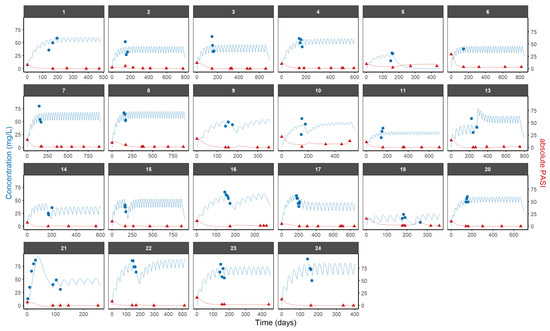 Predicted and observed PASI score (red) and SCK concentrations (blue) after the administration of SCK in patients with long-lasting psoriasis vulgaris. Individual predictions are represented by lines, and the SCK and PASI observations are represented by blue and red dots, respectively.