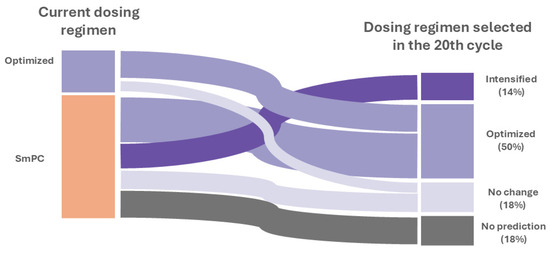 Supplementary Figure S4 illustrates the probabilities across treatment cycles for each patient. The MIPD strategy indicated that 50% (11/22) of patients would require an optimized dose regimen, while 14% (3/22) would need an intensified regimen compared to the clinical practice regimen used during the maintenance period of treatment with SCK. The optimized patients are suggested to follow non-standard dosage regimens: 150 mg q4w for 9% (1/11), 150 mg q5w for 9% (1/11), 150 mg q6w for 18% (2/11), 300 mg q5w for 45% (5/11), and 300 mg q6w for 18% (2/11) of patients. In patients requiring intensified regimens, switching to 300 mg q2w is advised for all. For 18% (4/22) of patients, no changes to their current regimen were predicted. Furthermore, this MIPD strategy helped identify 18% (4/22) of patients who would not reach the efficacy target (90% probability of PASI ≤ 1), enabling early recognition of those at risk of therapeutic failure. Figure 4 specifies the changes from the dose regimen in clinical practice to the predicted regimen during the maintenance phase of therapy with SCK (cycle 20).