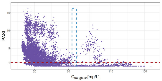 A more exigent Ctrough-ss range (64.2–69.3 mg/L) was proposed in this study to accomplish in 90% of patients an absolute PASI ≤ 1. A previously reported Ctrough-ss range (12.9–62.9 mg/L) was established in a prior population PK modeling investigation [21], which included individuals on a 300 mg q4w dosage regimen, and it was produced using simulated data from clinical trials in patients who were only beginning therapy with SCK, in which the efficacy objective was to achieve in week 12 the PASI 75. Conversely, the Ctrough-ss range found in this research stand for a more rigorous PD endpoint (PASI ≤ 1 or PASI 99) from patients in routine clinical practice. Also, the proposed Ctrough-ss range aligns with optimal response criteria consistent with current clinical guidelines (PASI ≤ 1), intended to enhance the quality of life and clinical results for those with persistent psoriasis vulgaris [59,60].
