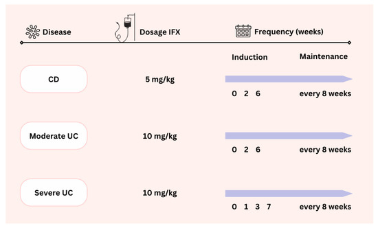 Dosing regimen of infliximab (IFX) according to the types of inflammatory bowel disease. CD = Crohn’s disease; UC = ulcerative colitis.