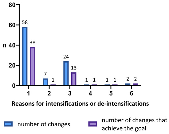 The only reason for de-intensification was a Cmin above the recommended levels. In cases of intensification, the main reason for a change in dosing was a Cmin below the range (62.37%), followed by a Cmin below the range together with high biomarkers and/or clinical non-response (25.81%). The percentage of total treatment interventions that achieved their goal was 59.25% during induction and 60.60% during maintenance. If we analyse this according to monitoring strategy, the percentage of treatment interventions that achieved their goals during induction was 63.16% in proactive TDM vs. 33.33% in reactive TDM and during maintenance, and 61.82% in proactive TDM vs. 54.54% in reactive TDM. Figure 2 shows a visual representation of the reasons for treatment interventions and the number of interventions that achieved the established therapeutic objective.