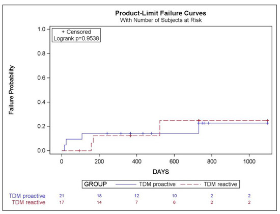 We did not find any statistically significant differences in treatment failures between patients who underwent proactive and reactive TDM (Table 5). The Kaplan–Meier analysis did not demonstrate a significantly lower cumulative probability of treatment failure in patients who underwent proactive compared to reactive TDM (log-rank p = 0.95) (Figure 3).