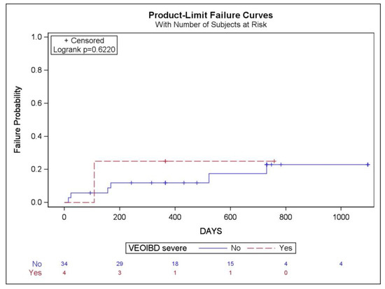 Regarding treatment failures by type of IBD, comparing the four severe VEOIBD patients with the 34 other children, at week 52, the severe VEOIBD patients had higher treatment failure rates (25% vs. 6.45%; p = 0.25) (Table 6). If we analyse the ratio between treatment failures and follow-up times with IFX (years), we obtain a ratio of 0.20 for severe VEOIBD and 0.10 for not severe VEOIBD (0.05 for CD, 0.17 for UC) (Table 6 and Table S2). There is no significant difference in the cumulative probability of treatment failure between patients with severe VEOIBD and those without (log-rank p = 0.62) (Figure 4). However, there does seem to be a trend suggesting a higher likelihood of treatment failure in patients with severe VEOIBD.